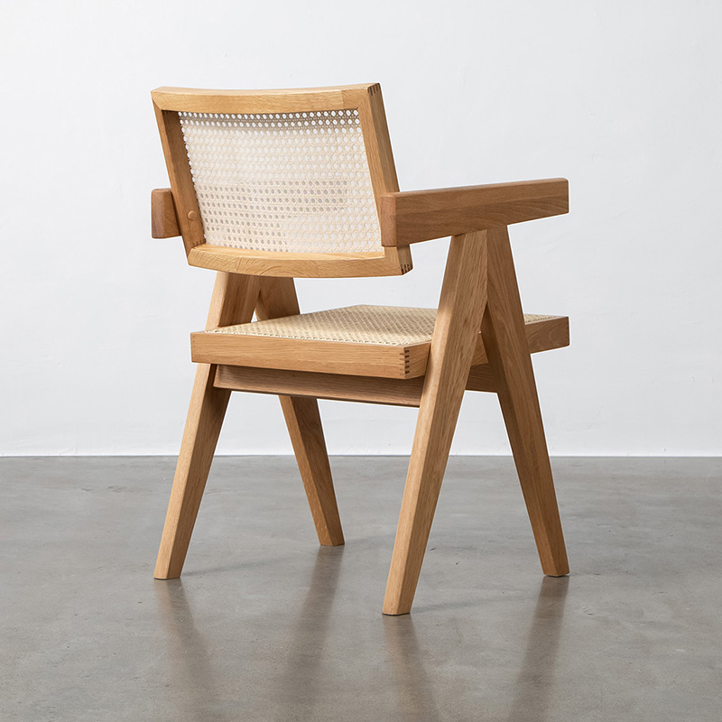 Replika fotela Chandigarh z naturalnego rattanu ma ramę z litego drewna jesionowego. Dostępne w różnych wykończeniach kolorystycznych drewna, jesionu z bejcą orzechową, jesionu czarnego itp.